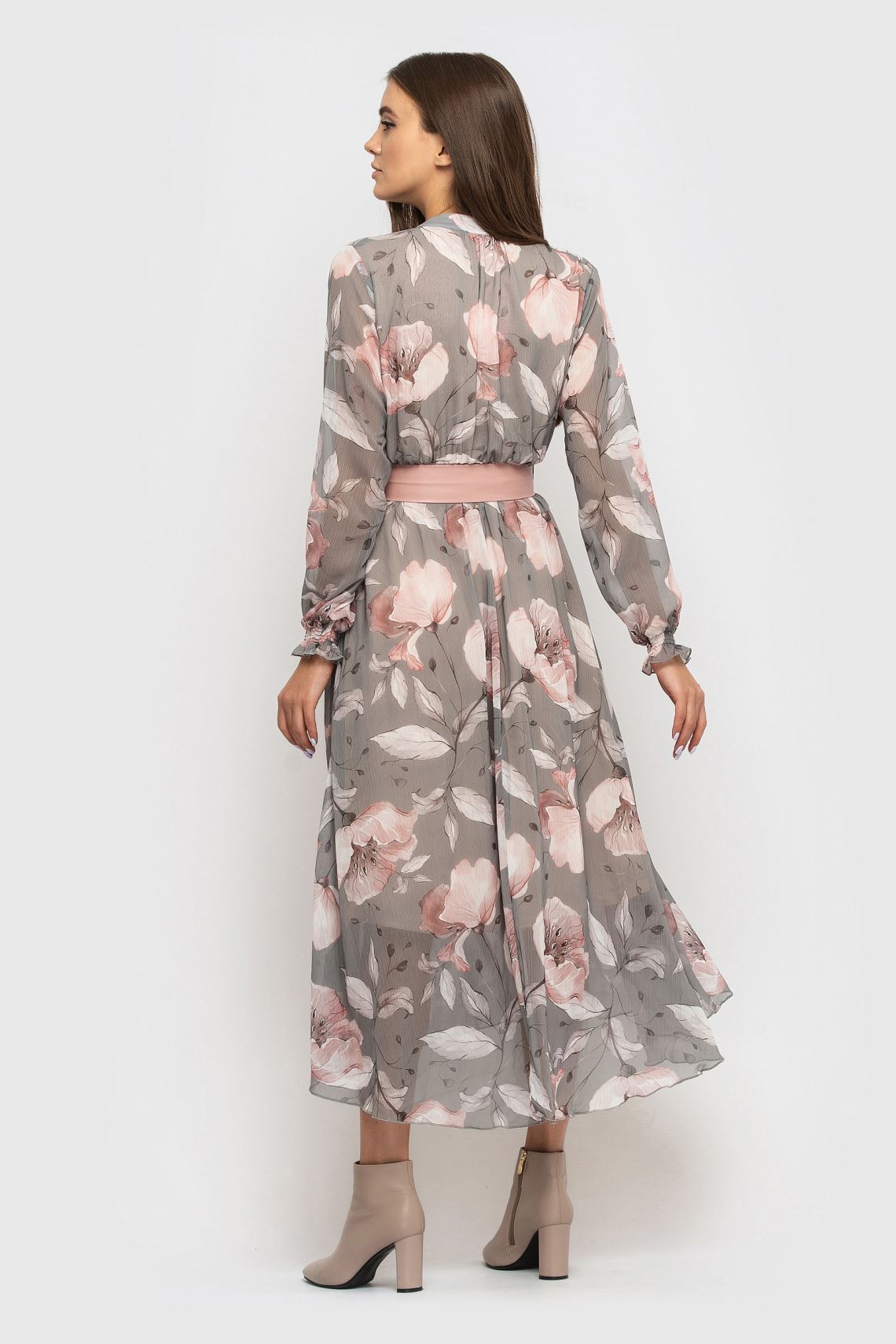 Квіткова сукня з відкритими плечима і рюшею понизу міді