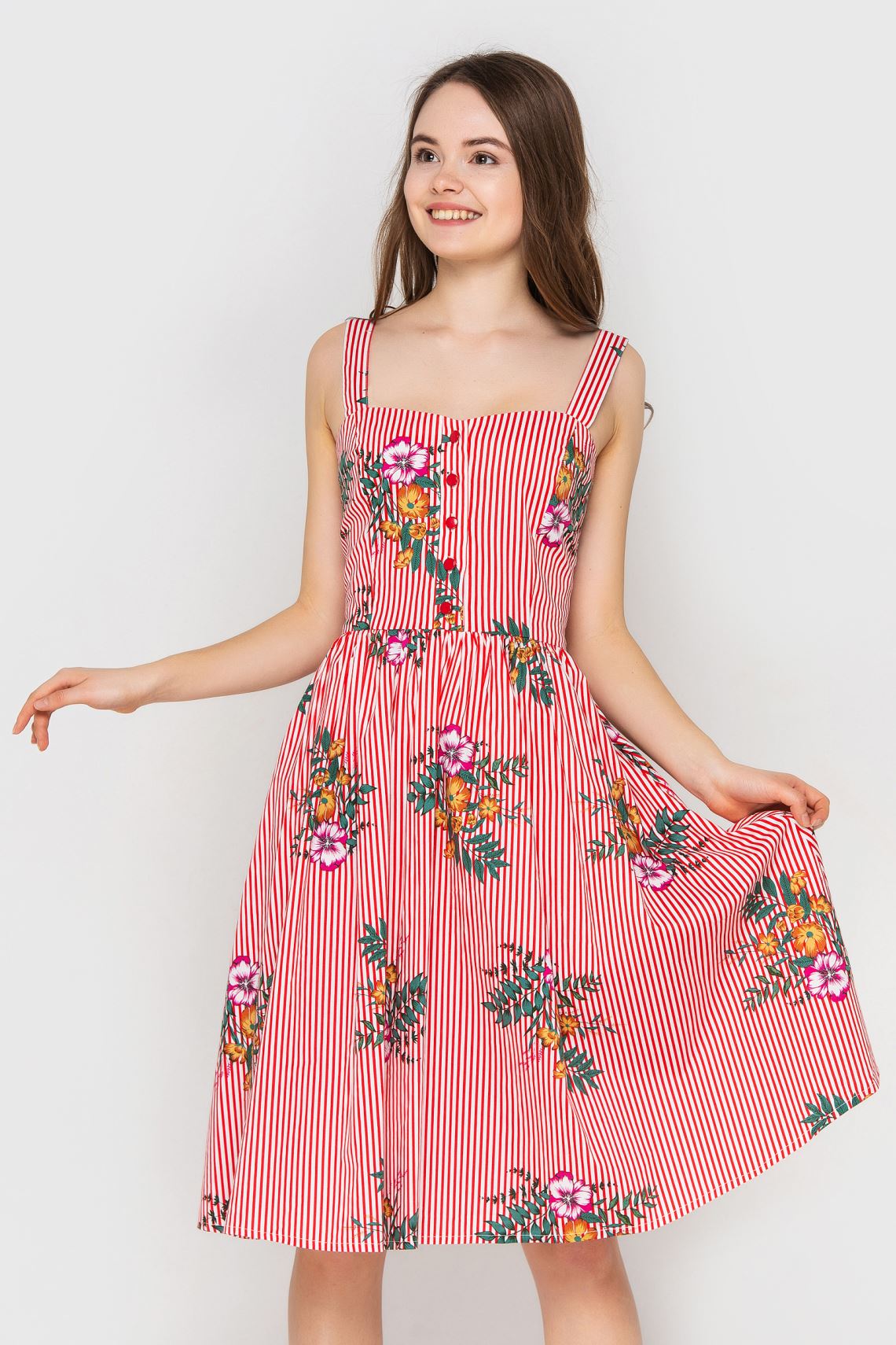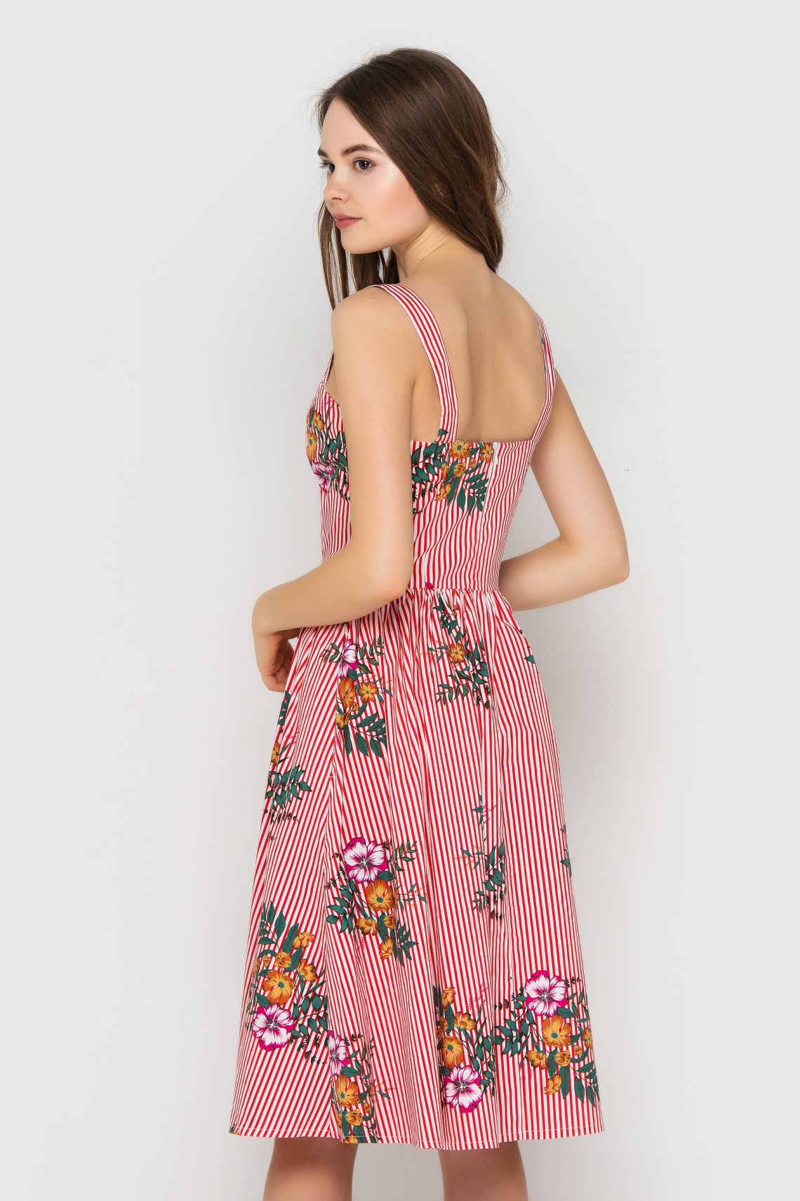 Сукня на бретелях приталеного крою з відрізною талією довжиною міді. Застібка позаду, кишені у бокових швах.